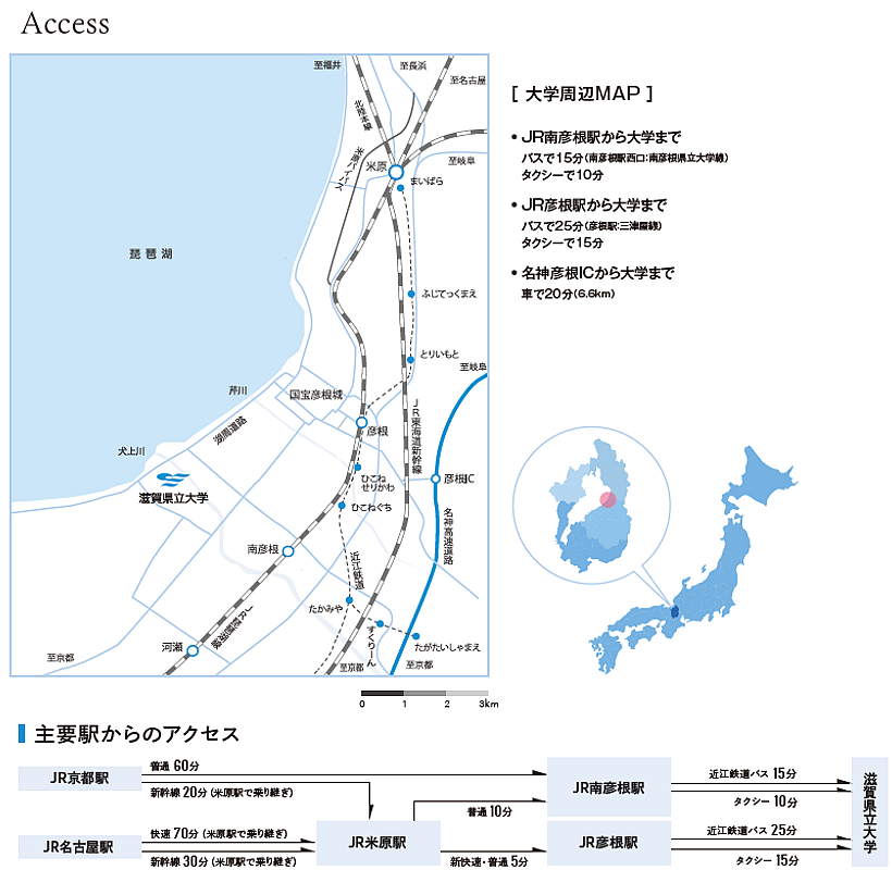 - JR・湖国バスを利用する場合:米原駅,京都駅からJR琵琶湖線(東海道線)で「彦根」または「南彦根」下車,湖国バス(「彦根」からは「彦根駅」バス停より三津屋線,「南彦根」からは「南彦根駅西口」バス停より南彦根県立大学線)に乗り換えて「県立大学」下車