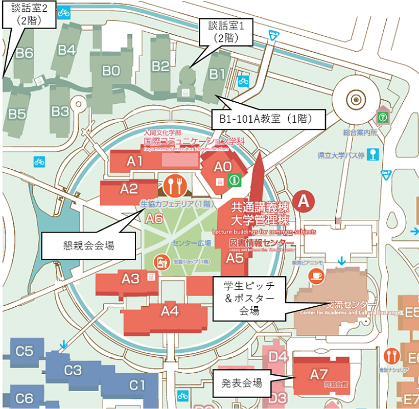- 自動車を利用する場合:名神高速道路彦根インターチェンジから約20分。県立大学北駐車場または南駐車場に駐車(無料)